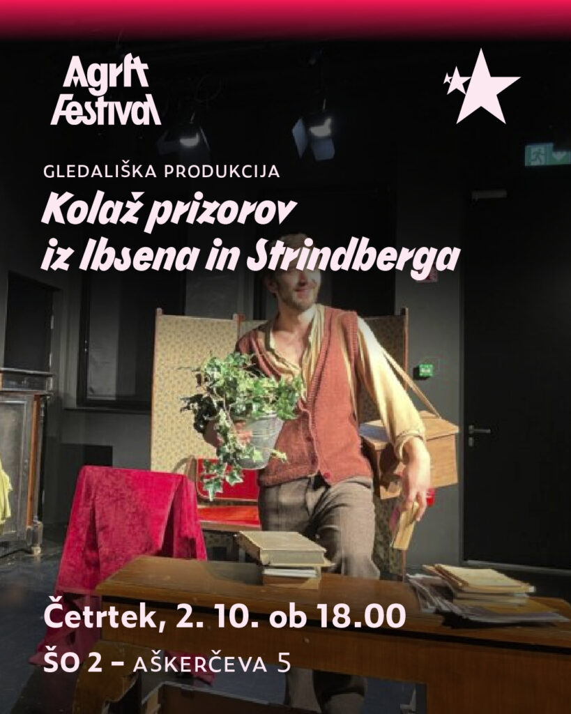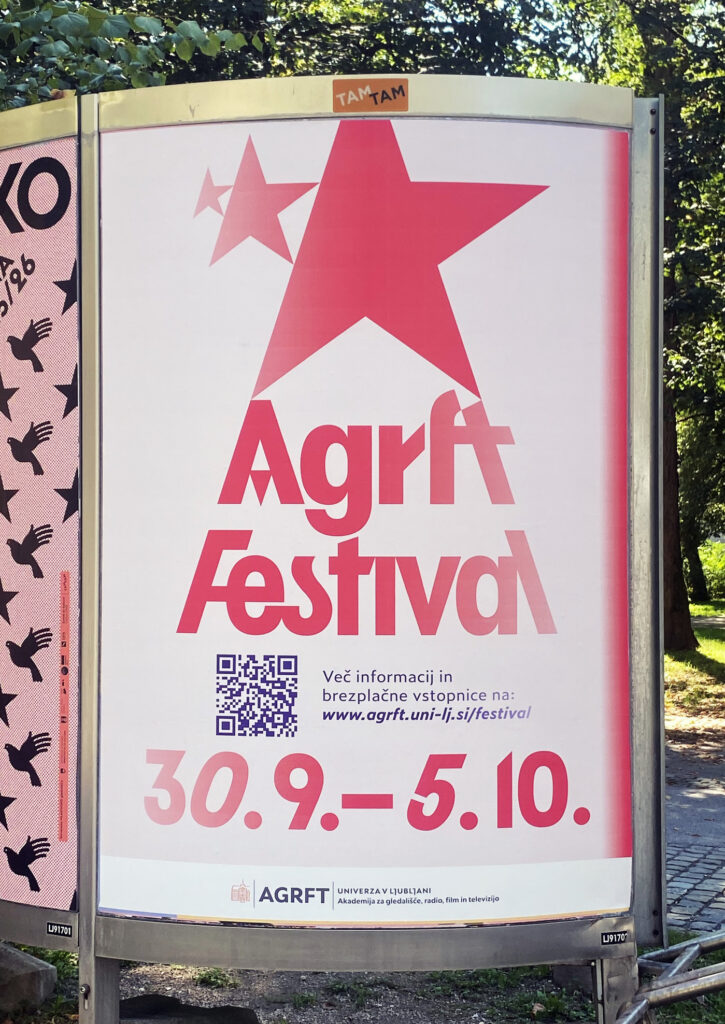 The University of Ljubljana’s Academy of Theatre, Radio, Film and Television (AGRFT) organized a festival in the first week of October. Students of acting, theater and radio directing, film and television directing, editing, photography, dramaturgy and stage arts present themselves with numerous theater productions, fiction and documentary films, television dramas, performances, radio plays, works created in courses in dance composition, theater singing, and presentations of publications.